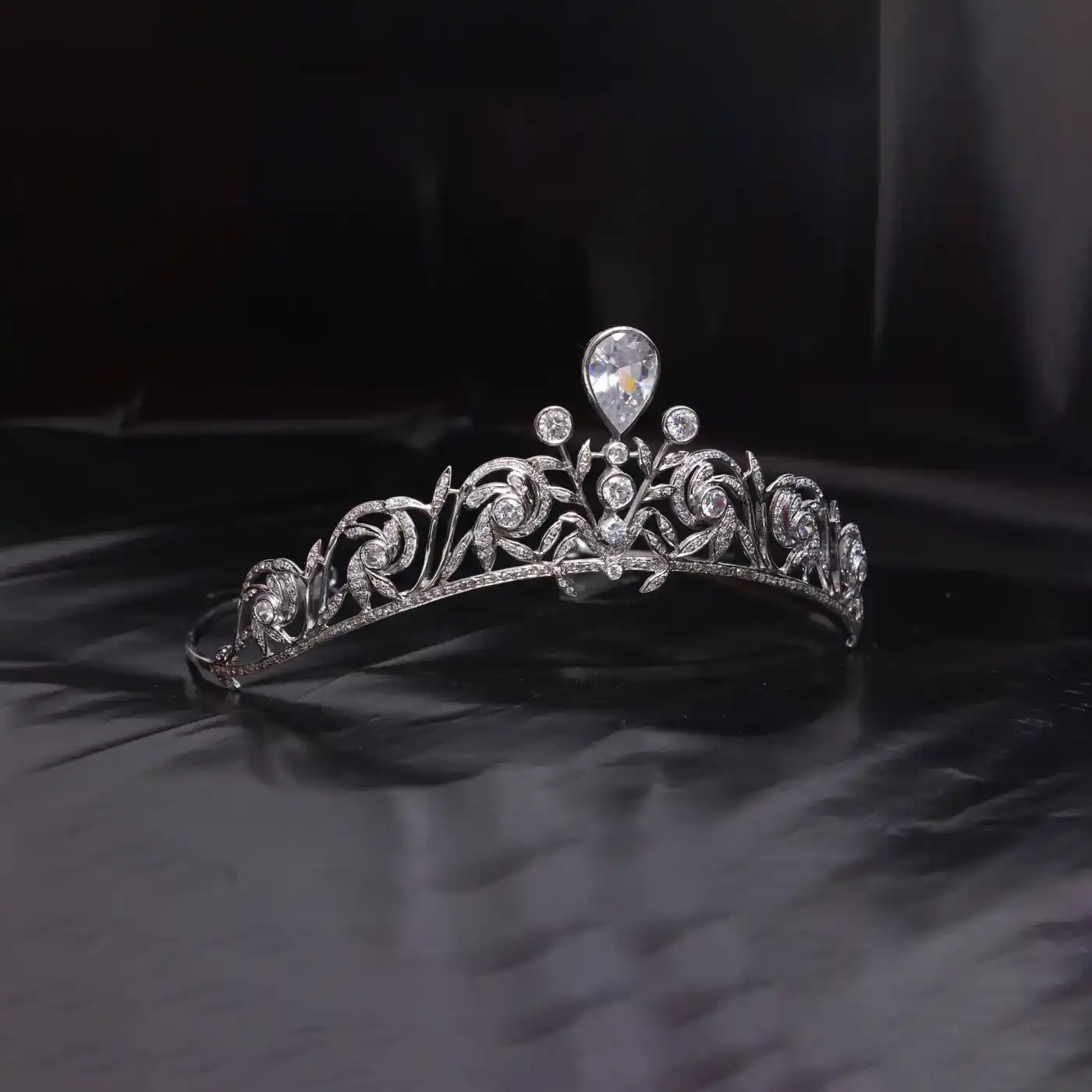 Crown Tiaraed by a sparkling pear-shaped center diamond, flanked by smaller round brilliants