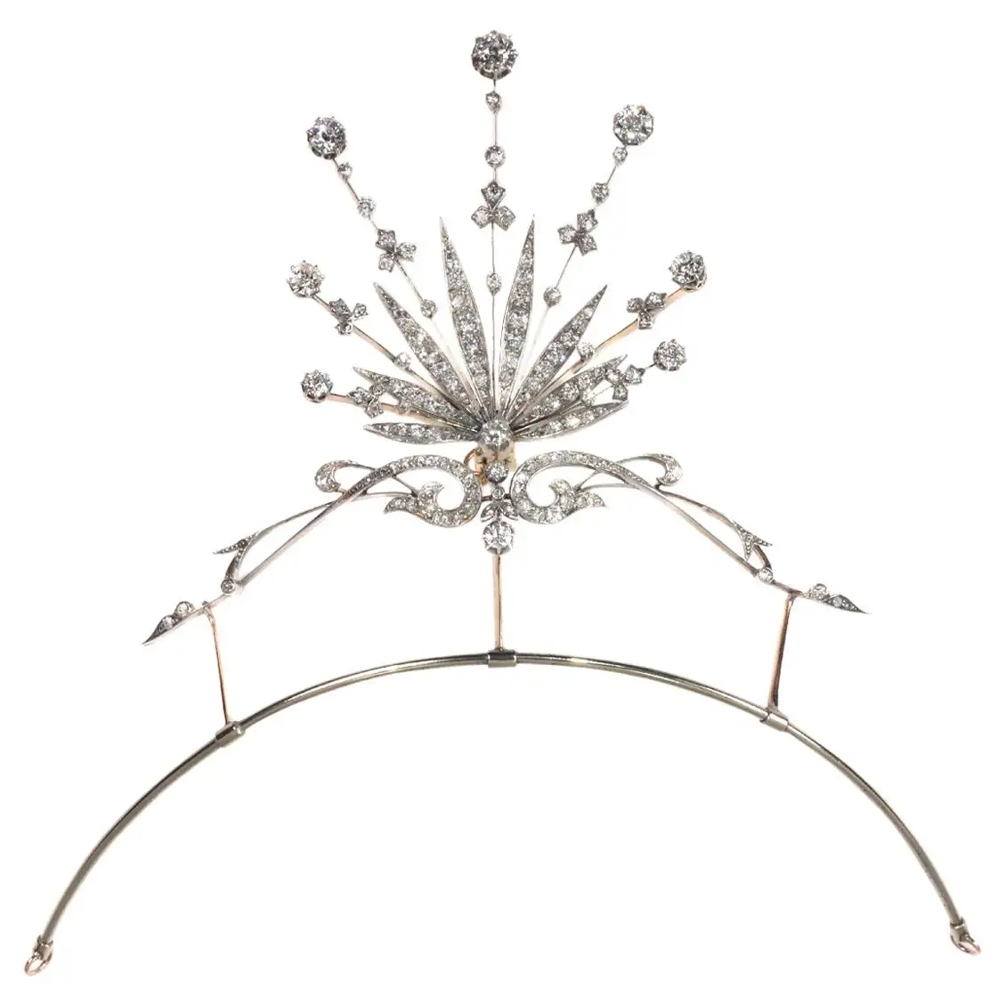 Flourishing base of curled scrollwork encrusted in old-cut diamonds, resembling trailing vines or flames