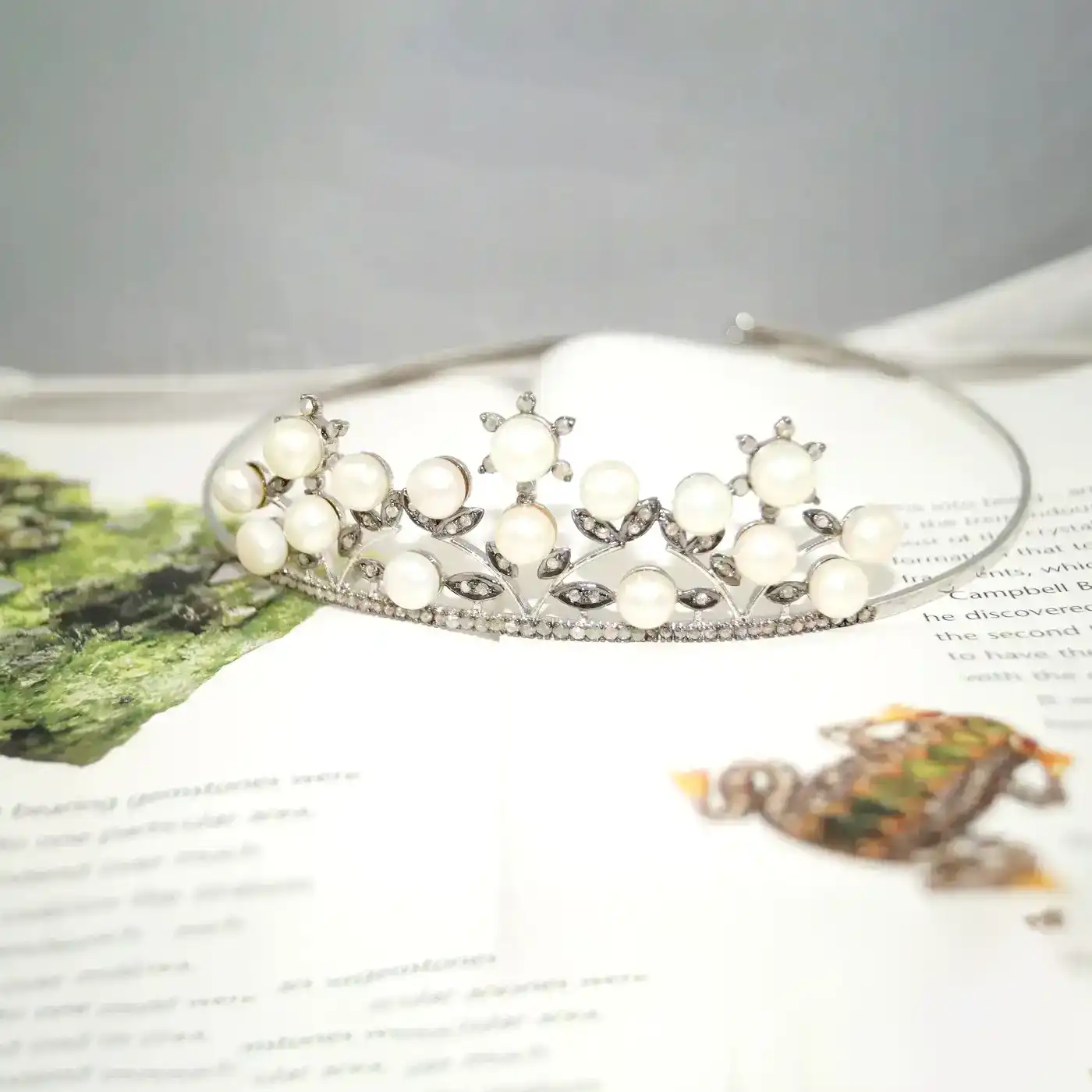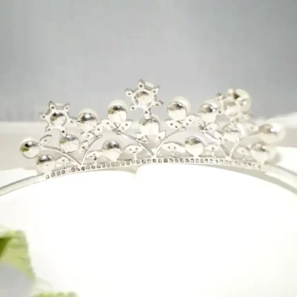 Grace your special day with this Elegant Pearl & Diamond Floral Tiara, a radiant expression of sophistication and timeless beauty. Featuring an intricate pattern of luminous white pearls nestled among leaf-shaped diamond accents, this tiara captures the delicacy of a blooming garden in full glory.